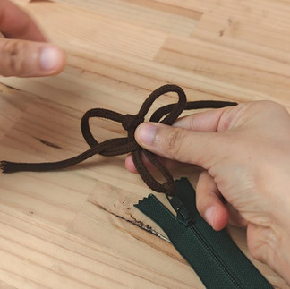 Place the zipper pull at the bottom, then lay the two cord ends above it on your work surface. Measure about 5 cm (2 in) from the zipper pull.