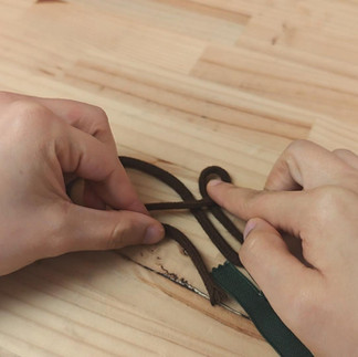 Take the right cord and pass it over both strands (which we will call the body of the keychain).