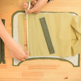 Take the 34 cm (13 ½ in) zipper and the tabs in outer fabric and lining.